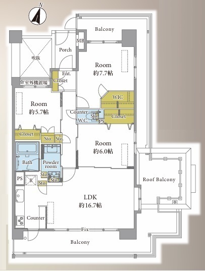 | 専有面積 | 76.95m² | バルコニー面積 | 12.75m²/南東側 |